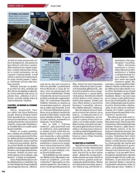 Článok v Plus7dní Video rozhovoru nájdete v linku https://plus7dni.pluska.sk/domov/fiktivne-bankovky-pre-guvernera-nbs-kazimira-ano-potesili-aj-jo-nesboa-fidela-castra